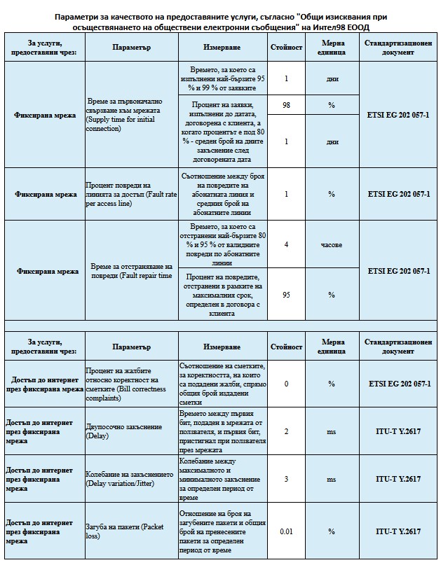 Постигнатите стойности на параметрите за качество на предоставяните услуги